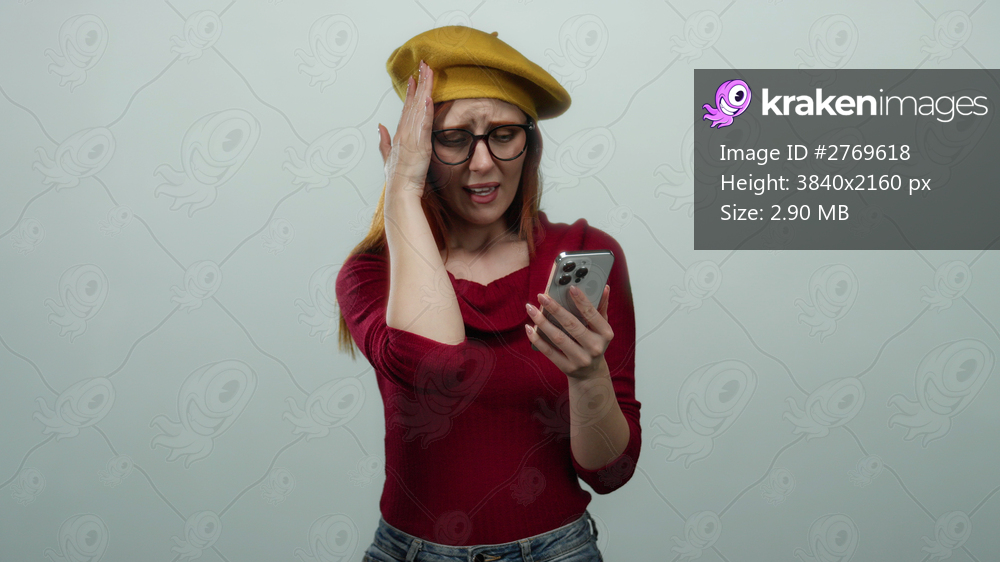 Woman with red hair and glasses appears concerned while using a smartphone against a white background, portraying emotion, focus, and technology in everyday life. - Kraken Images