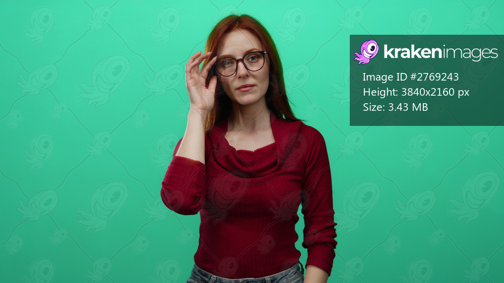 Woman with red hair and glasses in red sweater against green wall, expression thoughtful and confident, isolated setting emphasizing modern and stylish appearance - Kraken Images