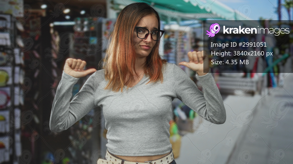 Woman with red hair and glasses points both thumbs toward her chest in a gray sweater amid a busy street market stall; self doubt.