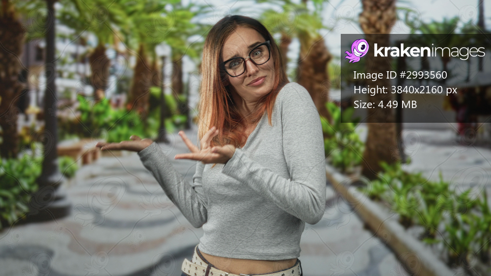 Woman with red hair and glasses showing palms up gesture on street promenade wearing grey sweater and belt, puzzled expression; confusion.