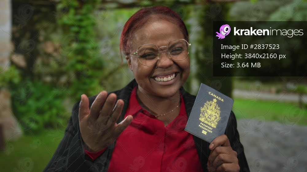 Woman with red hair and glasses smiles while holding canadian passport in green forest; joy confidence freedom exploration.
