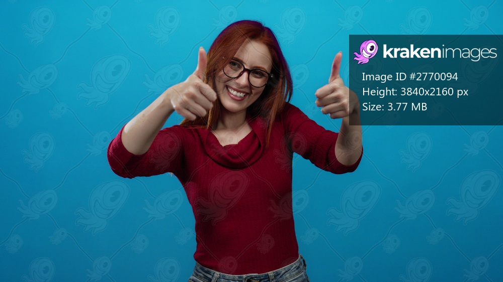 Woman with red hair and glasses smiling and giving a thumbs-up against a blue background, highlighting happiness and positive expression.