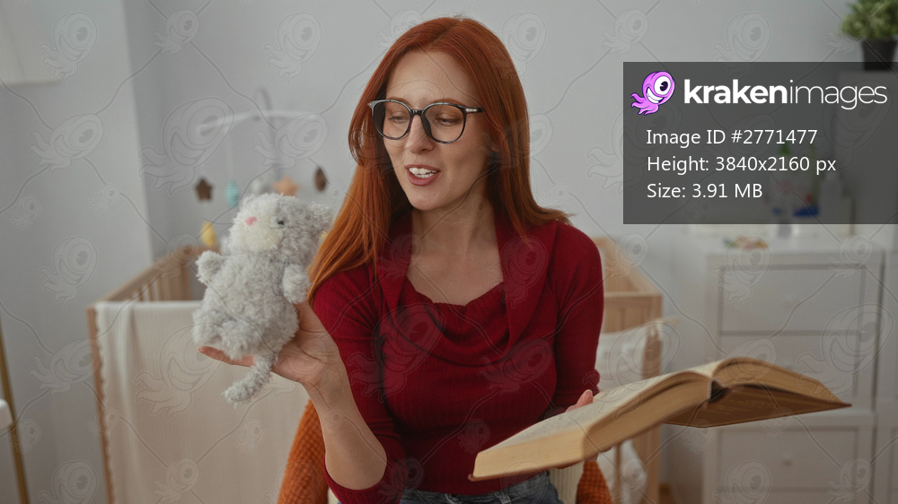 Woman with red hair and glasses smiling holding plush toy and book in cozy baby room with crib and dresser.