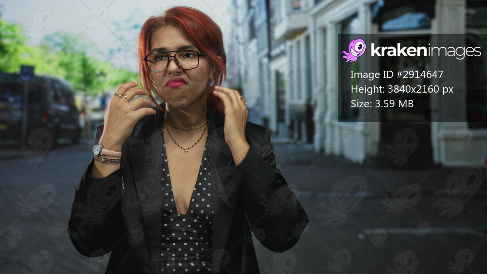 Woman with red hair and glasses touches neck and adjusts a necklace on a street while grimacing at a passing smell; disgust.