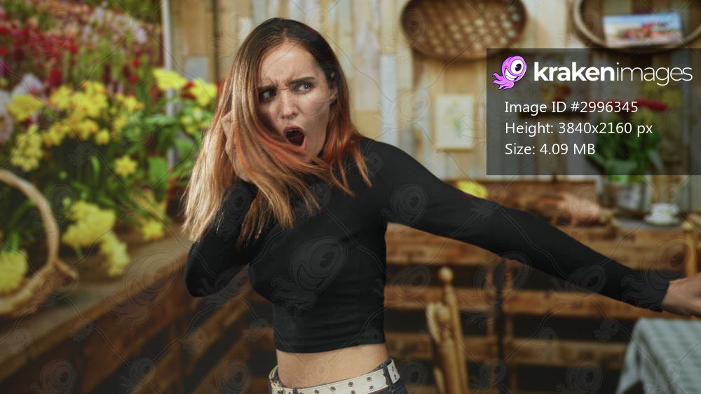 Woman with red hair, hand to ear and pointing finger, shouting near flowers in studio; anger confrontation.