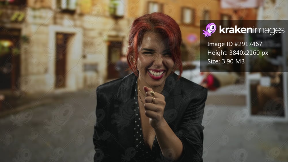 Woman with red hair and hand to mouth laughing on a cobblestone street in front of buildings wearing blazer and rings; joy playfulness.