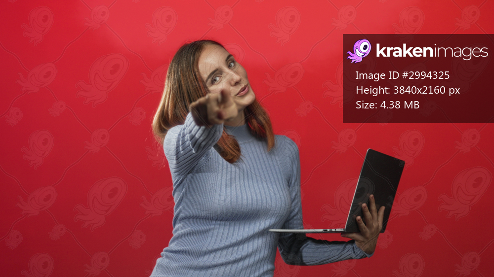 Woman with red hair holding a laptop points finger at camera in studio against a vivid red backdrop, wearing a blue sweater and smiling; confidence.