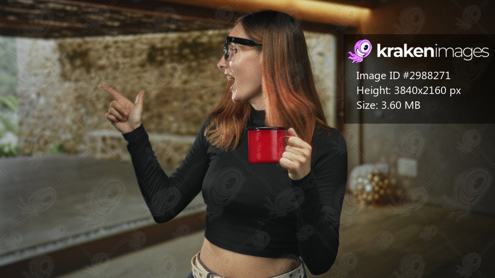 Woman with red hair holding a red mug points finger to the side in a studio while smiling, midriff exposed and wearing glasses; playful confidence.