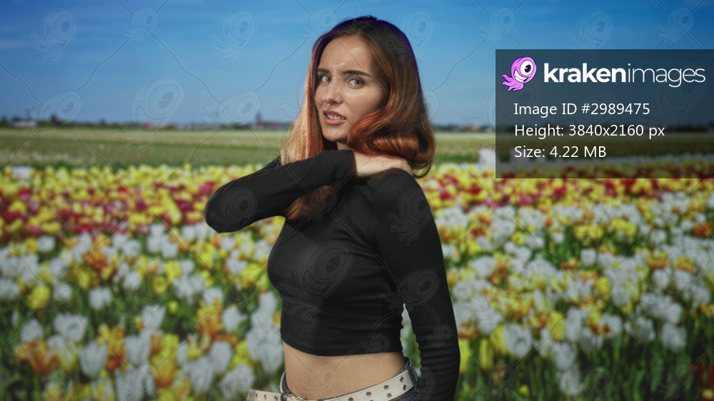 Woman with red hair holding her shoulder and wincing in a tulip field, cropped midriff and studded belt visible; discomfort concern.