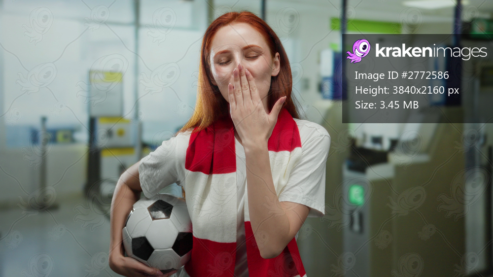 Woman with red hair holding soccer ball at airport terminal, smiling and making a hand gesture, wearing a red and white scarf, capturing a moment of excitement and anticipation. - Kraken Images