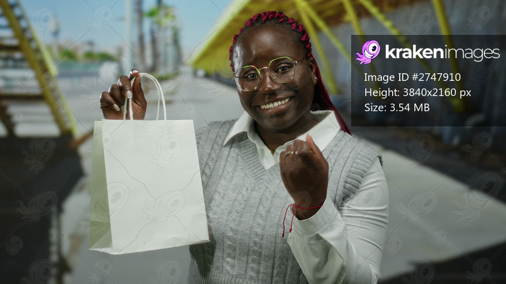 Woman with red hair holding white shopping bag smiles confidently in sunny urban street setting, showcasing casual fashion and cheerful city lifestyle outdoors. - Kraken Images