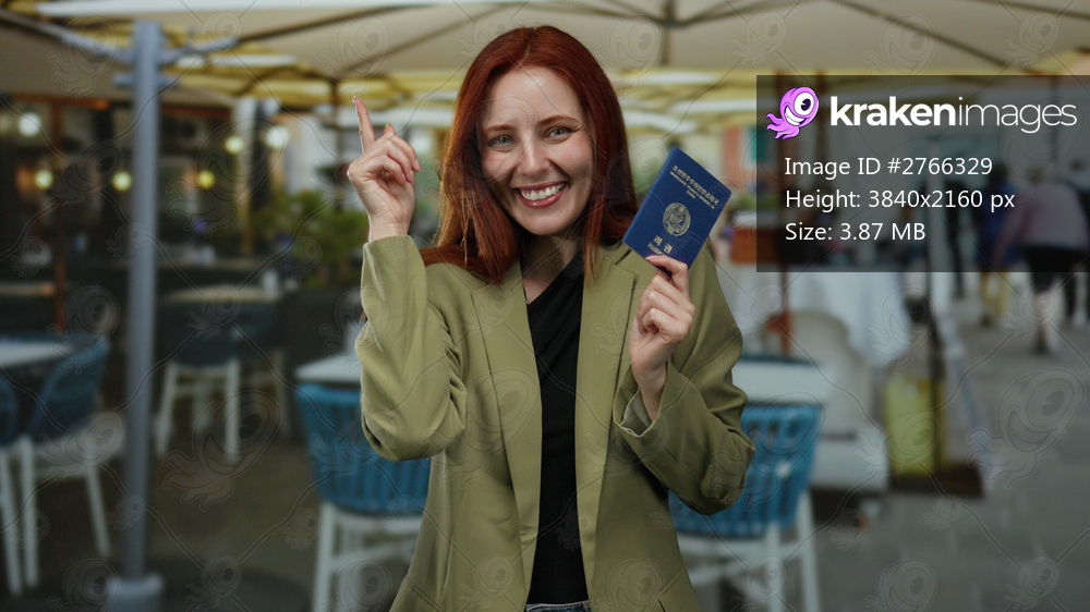 Woman with red hair holds korean passport on city terrace smiling and pointing upward wearing green blazer.