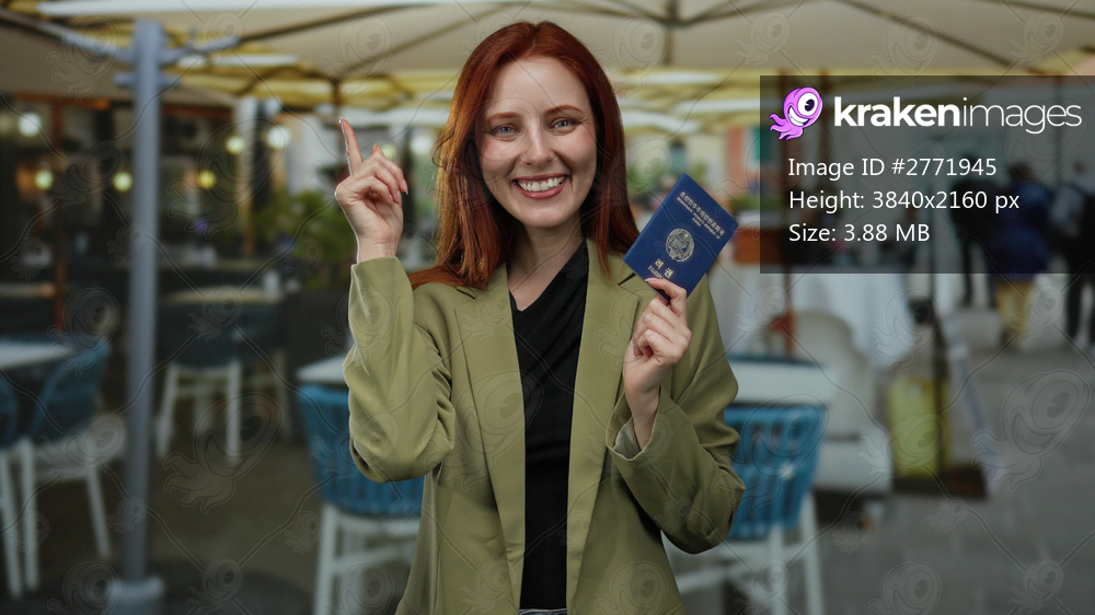 Woman with red hair holds korean passport on city terrace smiling and pointing upward wearing green blazer.
