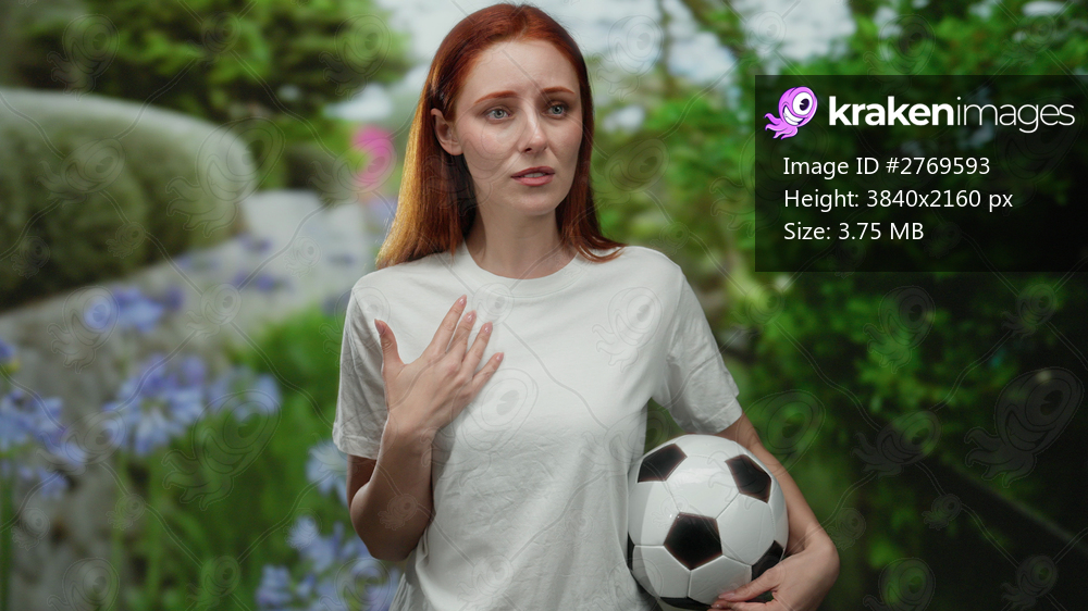 Woman with red hair in a park holding a soccer ball while wearing a white shirt surrounded by greenery and vibrant flowers, expressing surprise or confusion. - Kraken Images