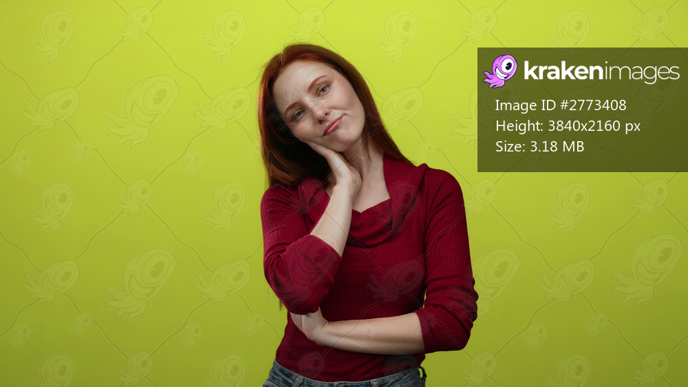 Woman with red hair in red sweater poses against vibrant yellow background, arms crossed expressing thoughtful contemplation.