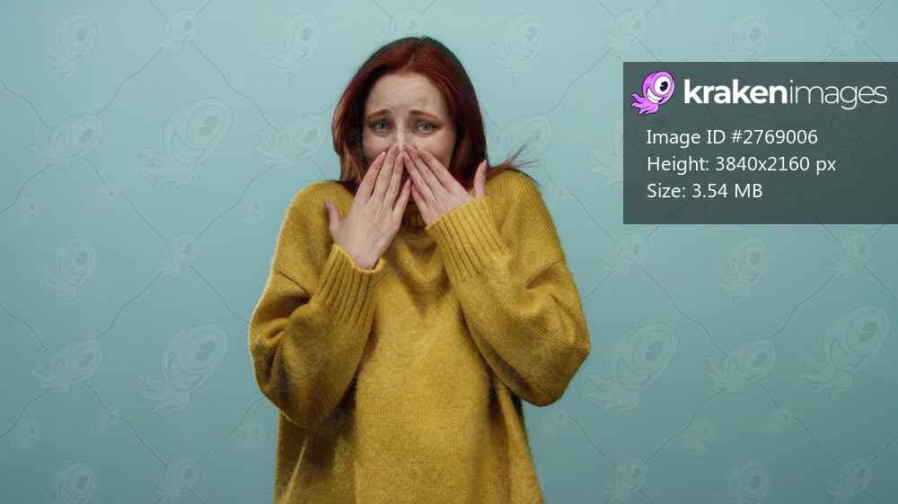 Woman with red hair in yellow sweater poses shyly against a blue wall, highlighting beauty and emotion in an isolated setting for creative use in stock media. - Kraken Images