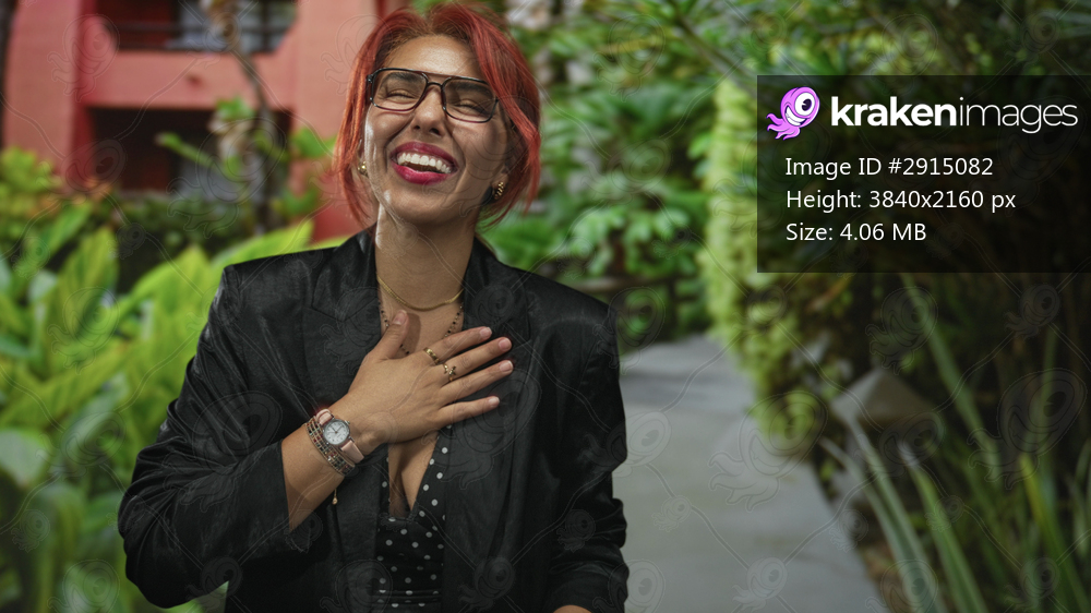 Woman with red hair laughing with hand on chest on building walkway wearing glasses and black blazer and polka dot top showing cleavage; joy gratitude. - Kraken Images