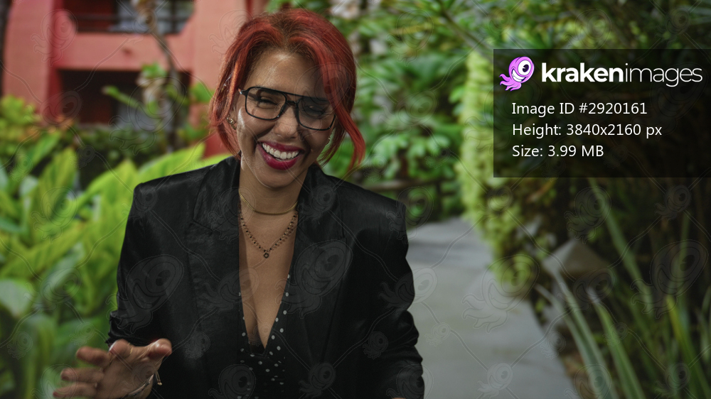 Woman with red hair laughing with hand on chest on building walkway wearing glasses and black blazer and polka dot top showing cleavage; joy gratitude. - Kraken Images
