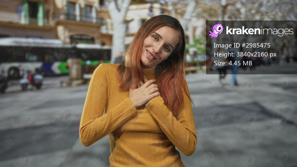 Woman with red hair places hand on chest in a sunlit street, smiling in a mustard sweater with a bus and tree lined avenue behind her; gratitude warmth. - Kraken Images