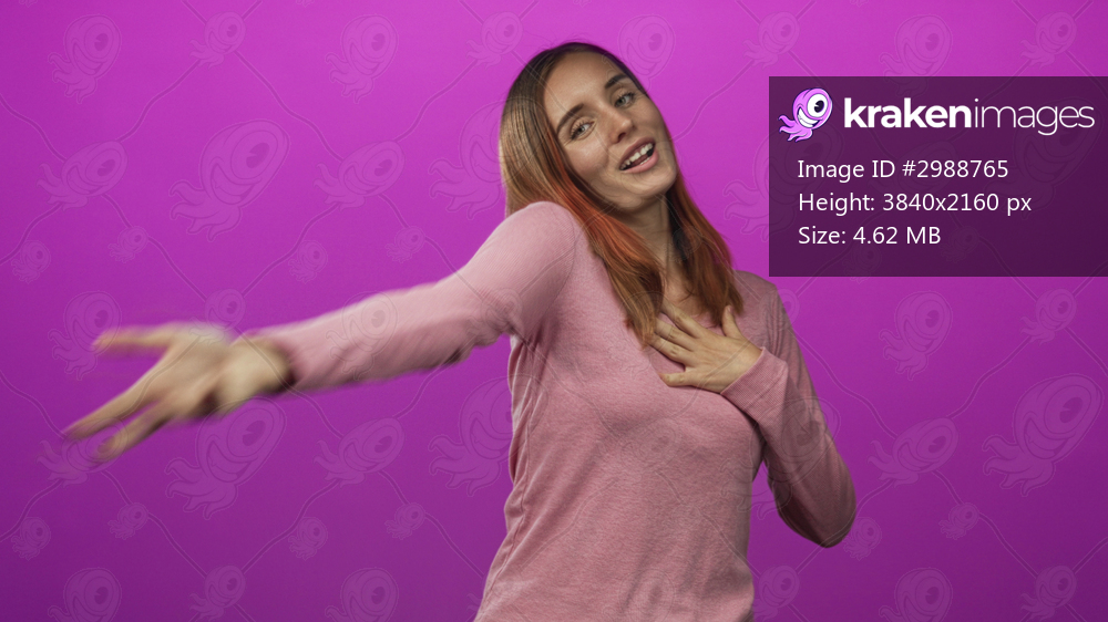 Woman with red hair reaching hand toward camera and placing hand on chest, smiling in a studio with magenta backdrop wearing pink top; joy.