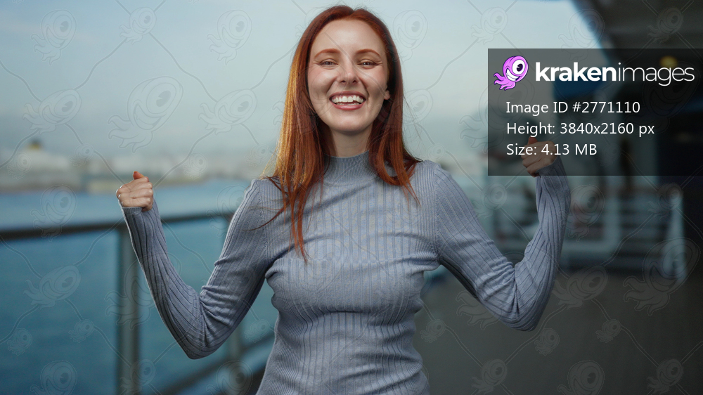 Woman with red hair smiling and flexing arms confidently outdoors on a seaside boat with a beautiful sea and port background
