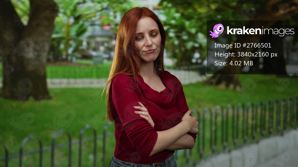 Woman with red hair stands with arms crossed looking sad in a park surrounded by lush greenery and a pathway creating a serene yet introspective outdoor setting. - Kraken Images