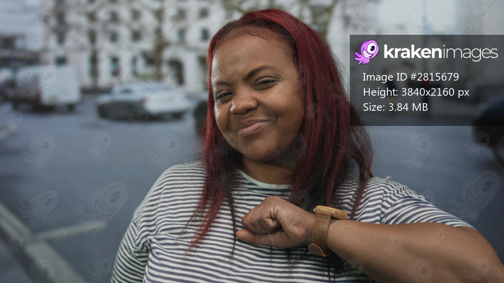 Woman with red hair and striped shirt raising a fist at her chest in a city street during daytime; empowerment.