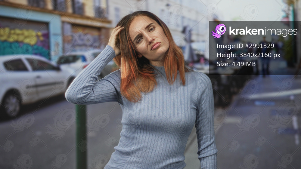 Woman with red hair touching her hair, tilting head on a narrow city street beside parked cars and outdoor cafe tables; melancholy solitude.