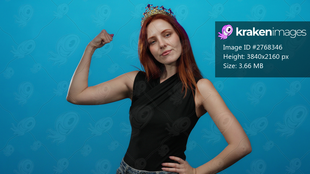 Woman with red hair wearing a crown flexing muscles confidently against a vibrant blue background conveying empowerment elegance and strength.