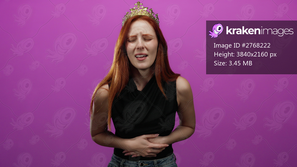 Woman with red hair wearing a crown holding her stomach in discomfort against a vivid pink background, capturing a mix of beauty and pain.