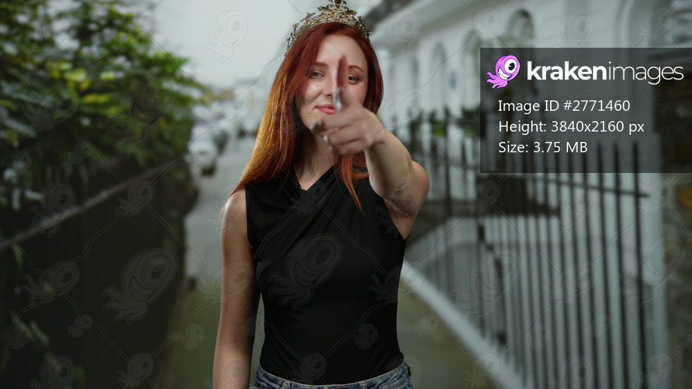 Woman with red hair wearing a crown points at the camera on a city street, surrounded by urban scenery, exuding confidence and natural beauty.