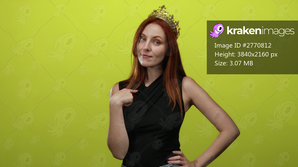 Woman with red hair wearing a crown points confidently to herself against a vivid yellow background, embodying self-assured beauty and poise.