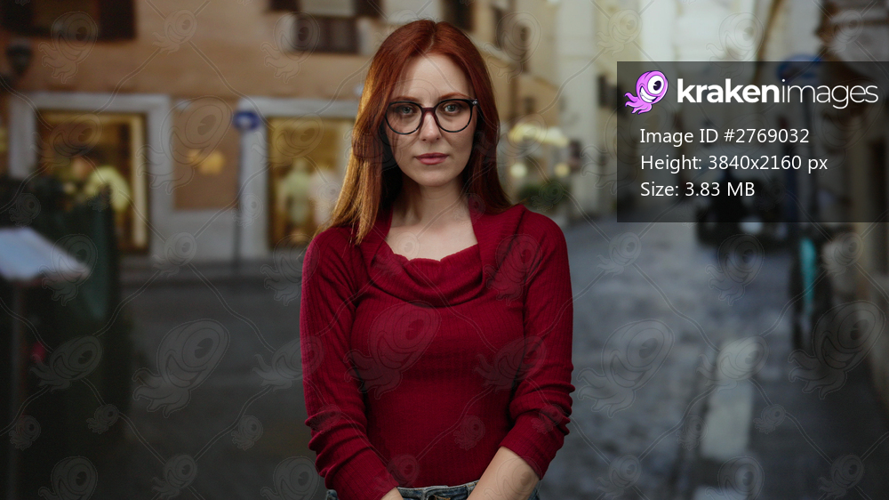 Woman with red hair wearing glasses and sweater standing on city street with historical buildings in background, conveying urban lifestyle and elegance. - Kraken Images