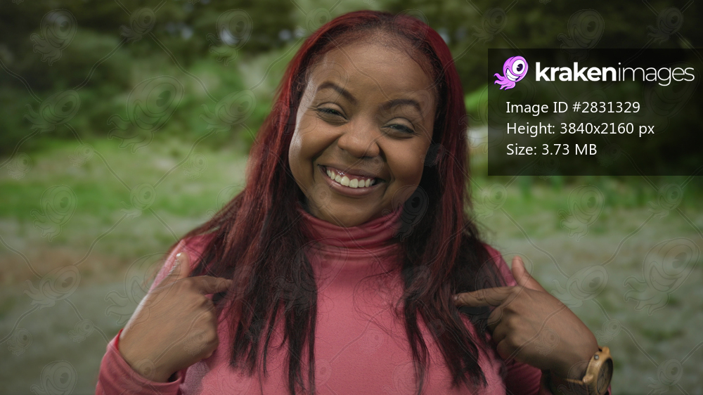Woman with red hair wearing pink turtleneck pointing finger to chest and smiling in green park; happiness.