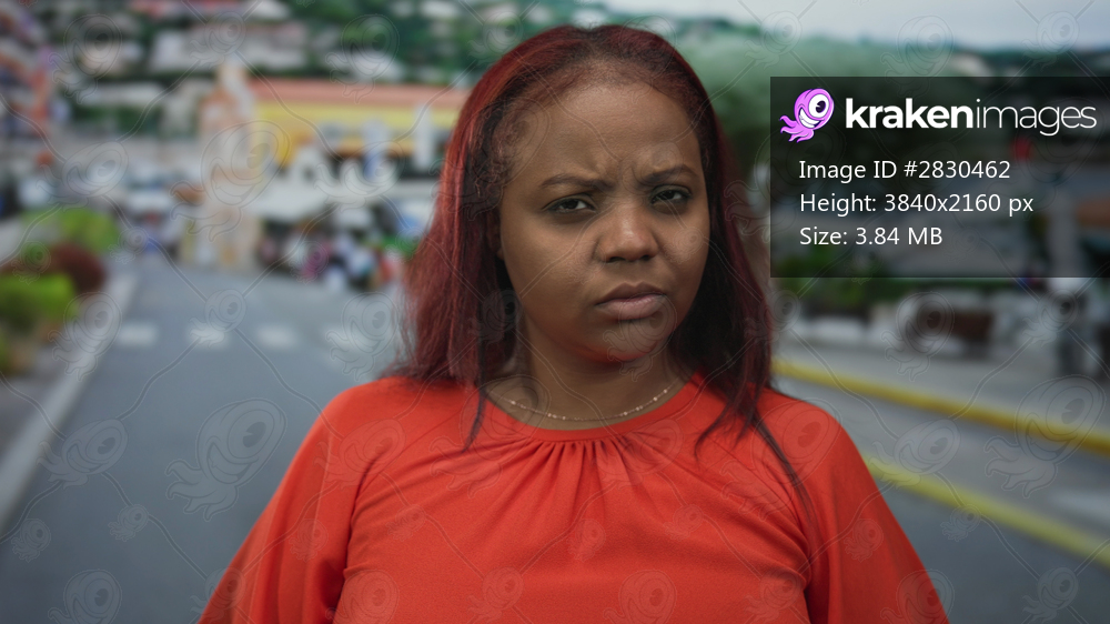 Woman with red hair wearing red blouse frowns and furrows brow while standing on busy city street; frustration.
