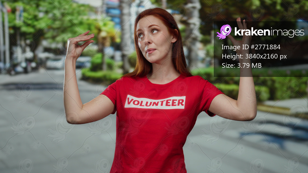 Woman with red hair wearing volunteer shirt on city street expressing emotions outdoors.