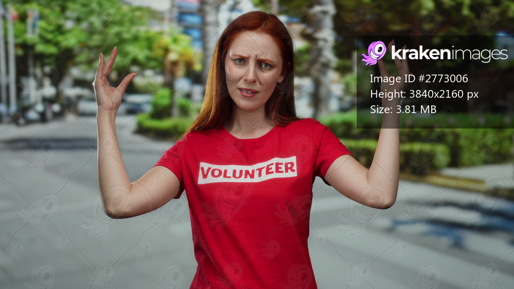 Woman with red hair wearing volunteer shirt on city street expressing emotions outdoors.