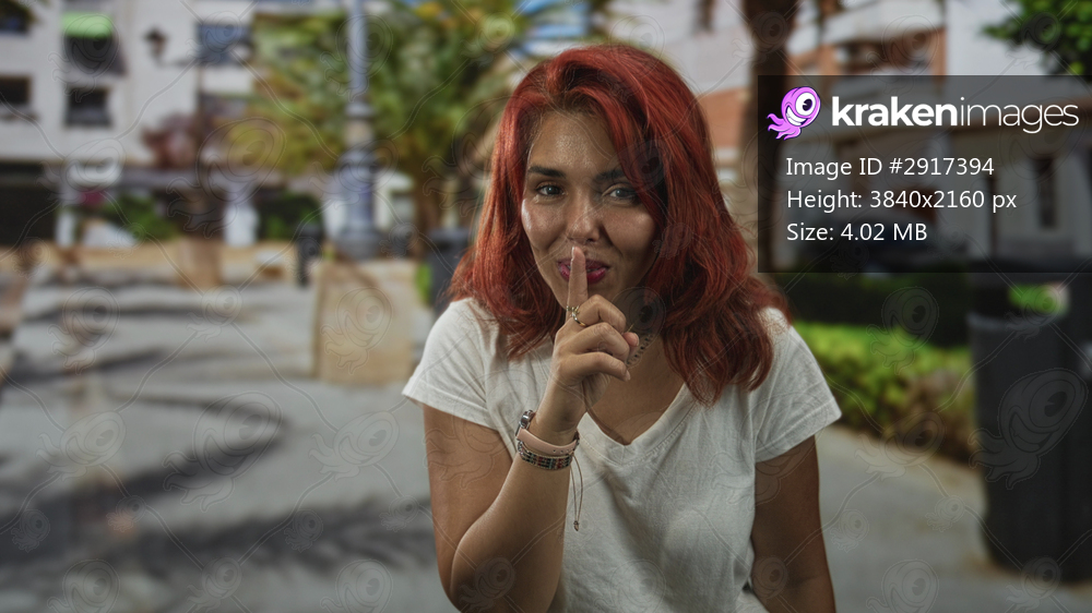 Woman with red hair and white t shirt, finger to lips for silence on a sunny street with palm trees and building facades; silence.