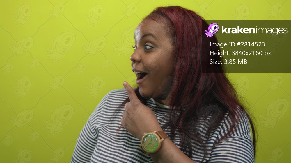 Woman with red hair and wooden watch in striped shirt points finger to bright green studio wall; surprise reaction.