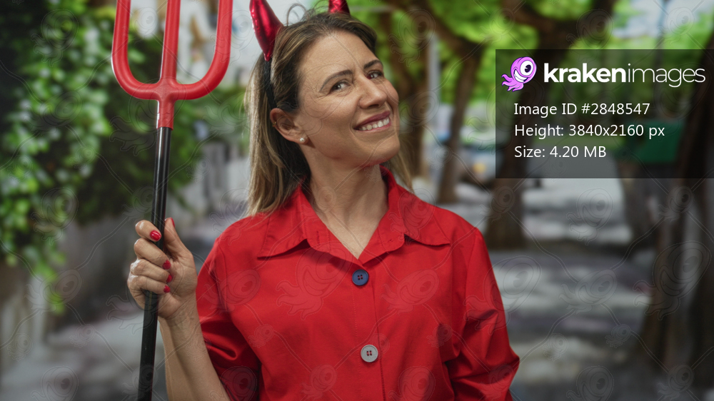 Woman with red horn headband holds red trident and sticks tongue out on a forest pathway; playfulness.