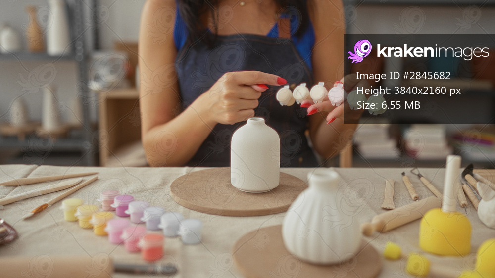 Woman with red nails points finger to paint pots over a ceramic vase in studio; creativity serenity.