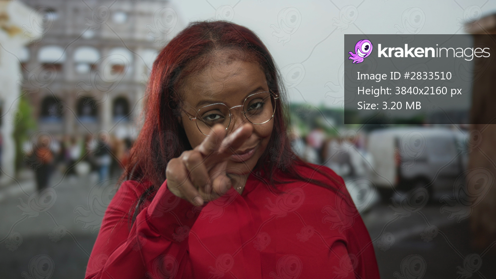 Woman red shirt glasses hand binoculars gesture at roman coliseum building; watching exploring curiosity.