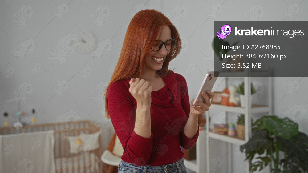 Woman with redhead hair using smartphone in cozy home bedroom decorated with plants and baby crib, expressing joy and connection in modern indoor setting. - Kraken Images