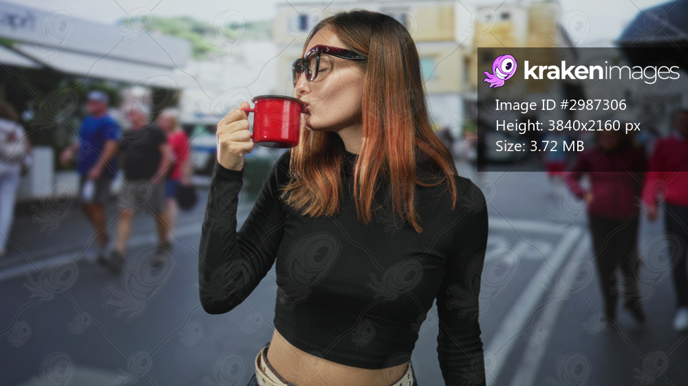 Woman redhead holding red mug up on street, smiling and wearing large glasses, cropped black turtleneck visible, pedestrians and market buildings behind; cheerful moment. - Kraken Images