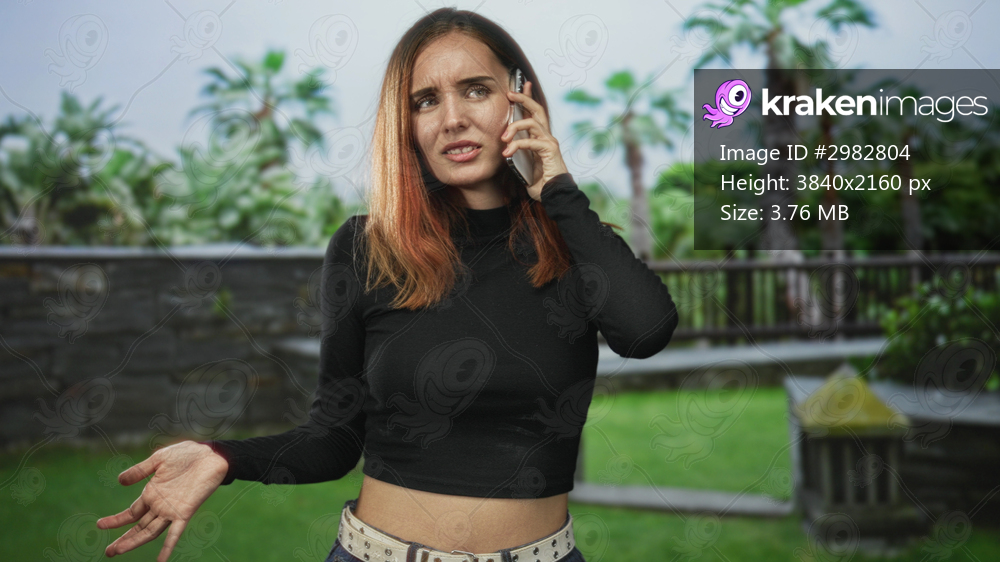 Woman redhead holding smartphone to ear, bare midriff visible, standing by stone wall and railing near building grounds with palms, looking upward; concern. - Kraken Images