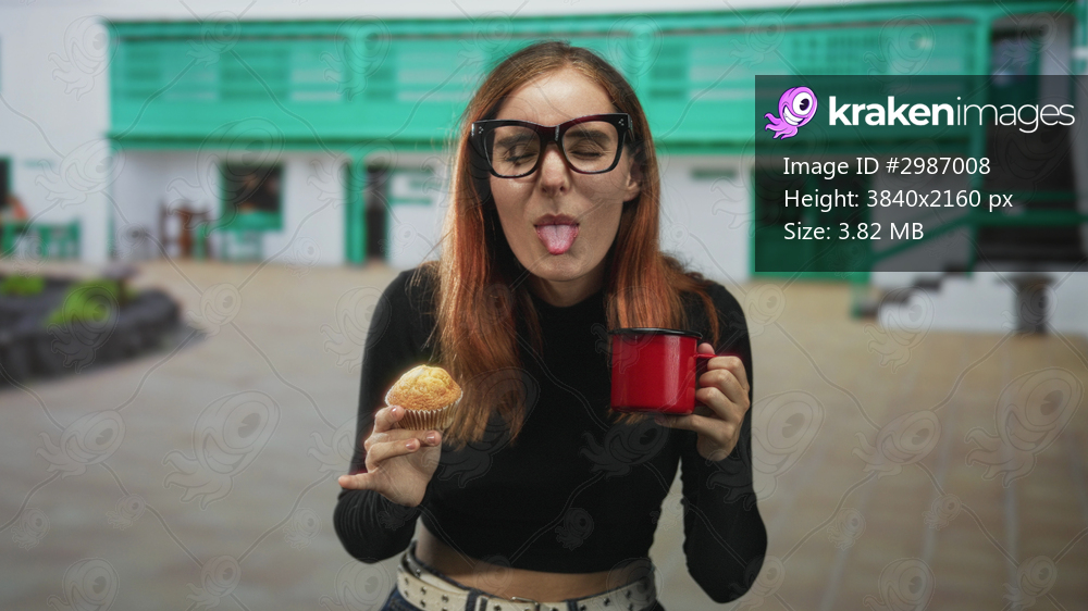 Woman redhead holds red mug and muffin, tongue out and smiling, in front of building; playful morning.