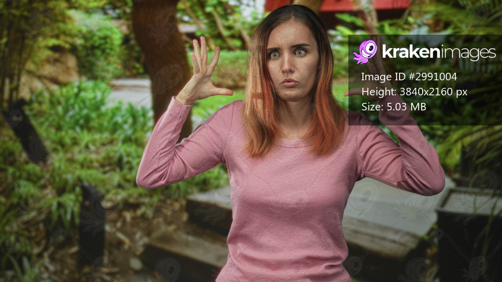 Woman redhead in pink sweater with hands raised and splayed fingers standing on stone steps in a forest setting; surprise.