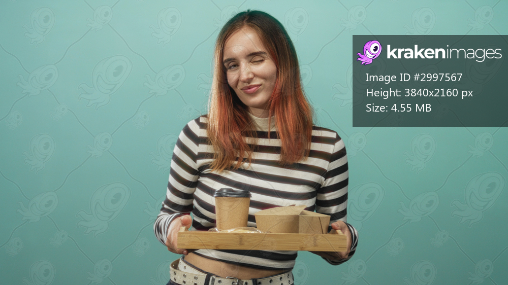 Woman redhead in striped top holds a wooden tray with coffee cup and takeout cardboard boxes in studio; welcoming hospitality.