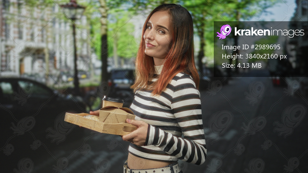 Woman redhead in striped top holds coffee cup and cardboard takeout tray, bare hand and midriff visible, standing on a city street lined with trees; casual confidence. - Kraken Images