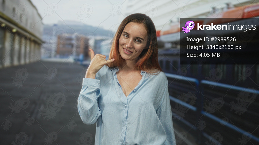 Woman redhead pointing finger at camera near lifeboats on a ferry deck building, light blue shirt and relaxed pose; confidence.